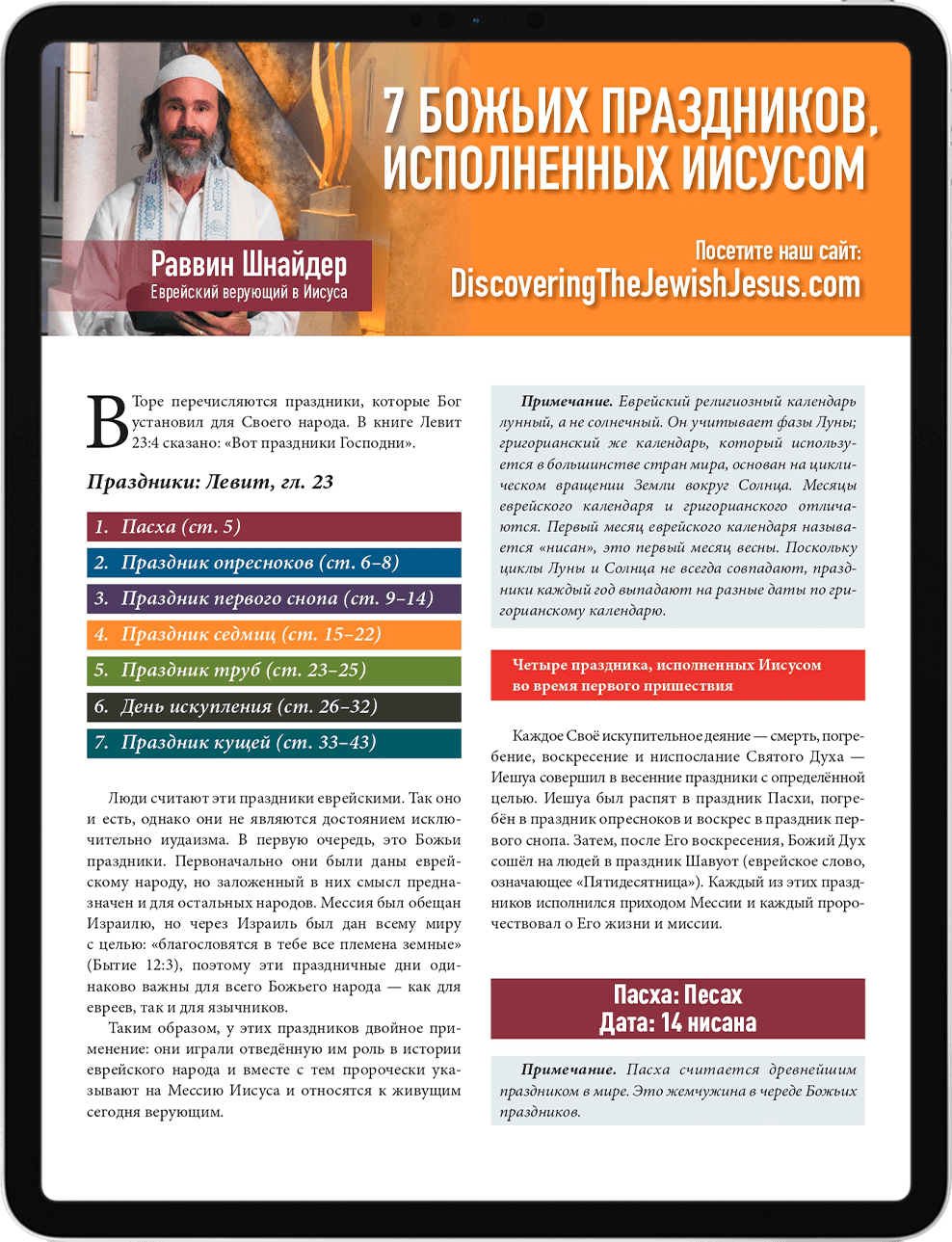Как весенние праздники связаны с первым пришествием Иешуа, а осенние – праздник труб, день искупления и праздник кущей – соотносятся с Его вторым пришествием, рассказывает Раввин Шнайдер в своей брошюре «Семь Божьих праздников».